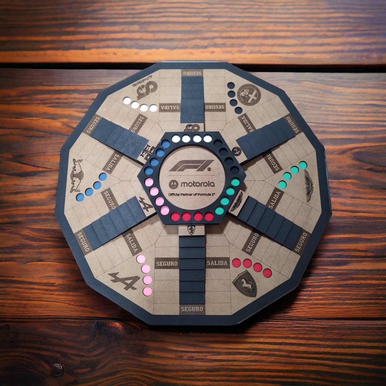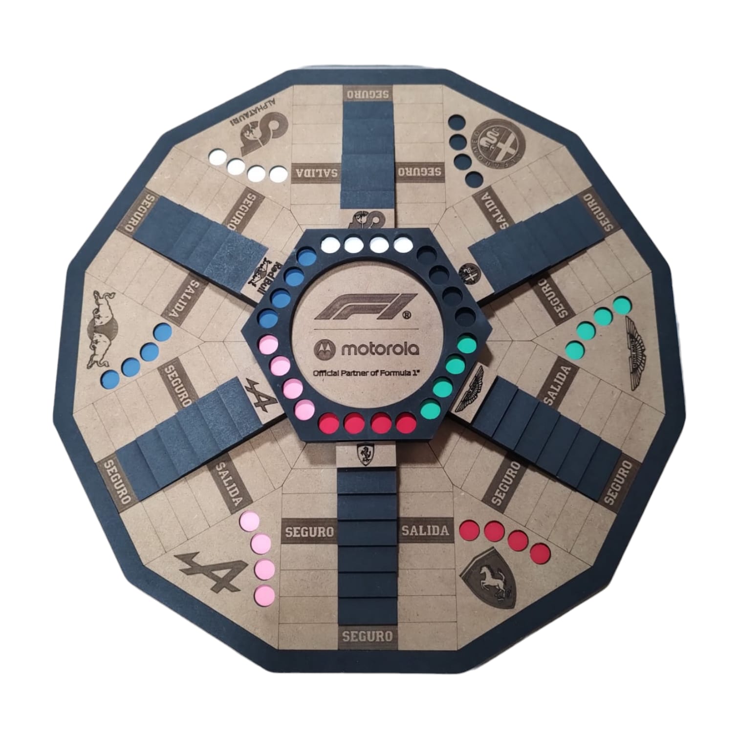 El parques 3D de 6 puestos en MDF de alta densidad, que incluye fichas en MDF y 1 ficha de repuesto por cada puesto. Además, viene en una caja de cartón resistente y también incluye un par de dados.
